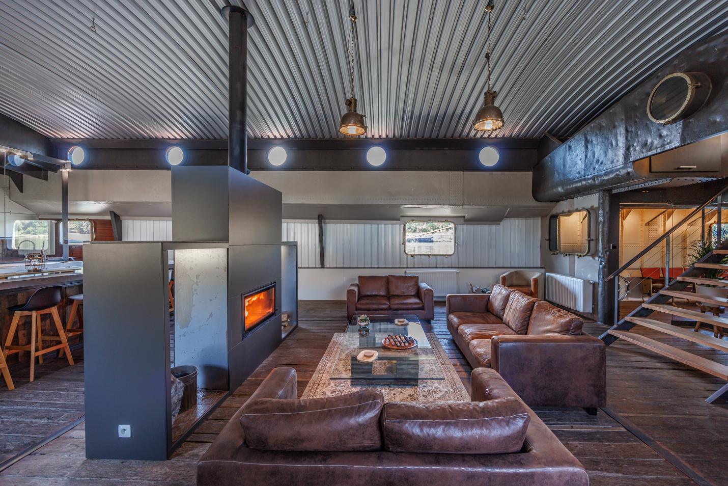 Welcome to our lounge, where the original azobe wood floor creates a warm and timeless atmosphere. Discover a unique blend of industrial style and comfortable modernity. Modern touches, contrasting with the authentic wood, create harmony between the old and the new.